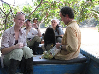 Krista and her first pirahna, caught with a stick and string. She almost tipped me, the guide, and herself out of the canoe when she yanked the fish out of the water and our guide yelled Pirahna!